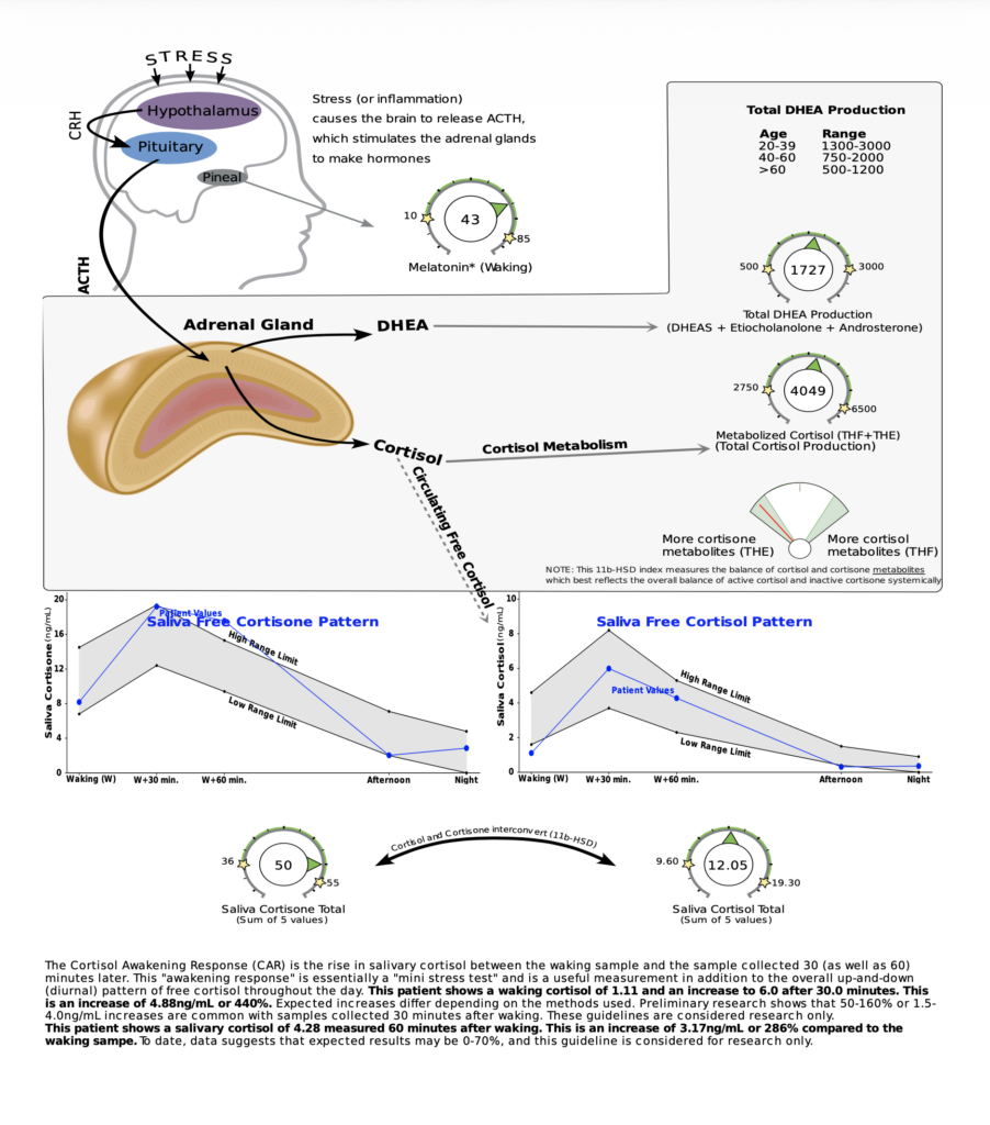 - HPA (Hypothalamic-Pituitary-Adrenal) axis dysregulation: low waking cortisol, elevated cortisol awakening response (CAR) – elevated at %440 compared to reference point of 50-160%, afternoon fatigue indicated by below range levels of afternoon cortisol. There’s AM & PM cortisol (blood serum) then there’s testing your CAR with DUTCH PLUS testing using saliva samples for a more accurate picture of your cortisol levels throughout the day. Why is it measured in saliva I know it’s a more accurate testing for cortisol I wonder if using daily miswak can help reduce cortisol levels from the jump. i really need a place to journal all of this. We still haven’t even fully explored the gut microbiome and health/medicine/nutrition changes every ~5-10 years & the research is behind so there’s always interesting connections to be made. My CAR makes sense I used to wake up feeling exhausted in the morning just by thinking about everything I wanted to get done for the day it’s a self imposed to do list. It’s not a bad thing, it just needed a reframe – it just means I have goals for myself & that’s exciting.
