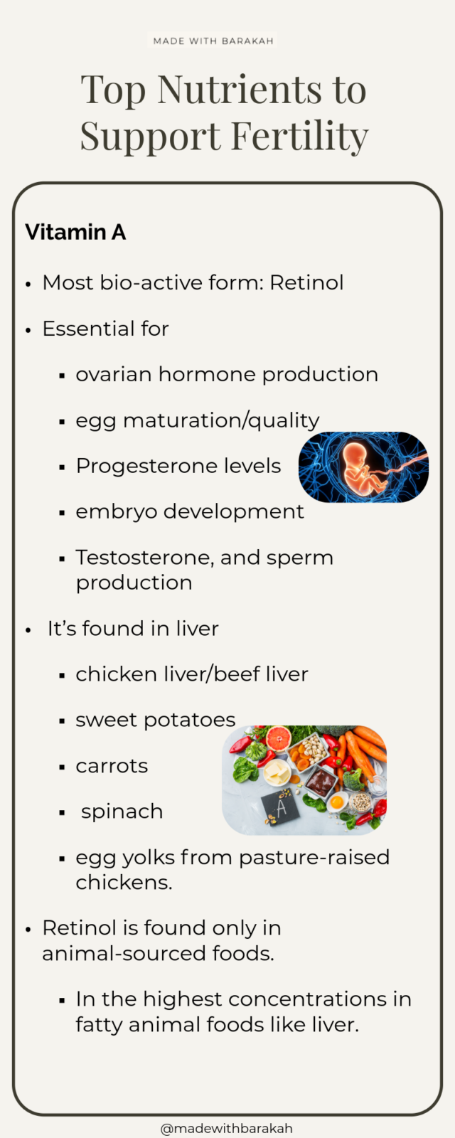 Vitamin A: (in the most bioactive form is known as retinol) essential for ovarian hormone production (including estrogen and progesterone), egg maturation and quality, progesterone levels, and embryo development where it affects the development of the baby’s brain, eyes, thyroid, limbs, lungs, and immune system: it’s found in liver (beef, chicken), sweet potatoes, carrots, spinach, and egg yolks from pasture-raised chickens. Retinol is found only in animal-sourced foods and in the highest concentrations in fatty animal foods like liver. Vitamin A is also essential for testosterone and sperm production.