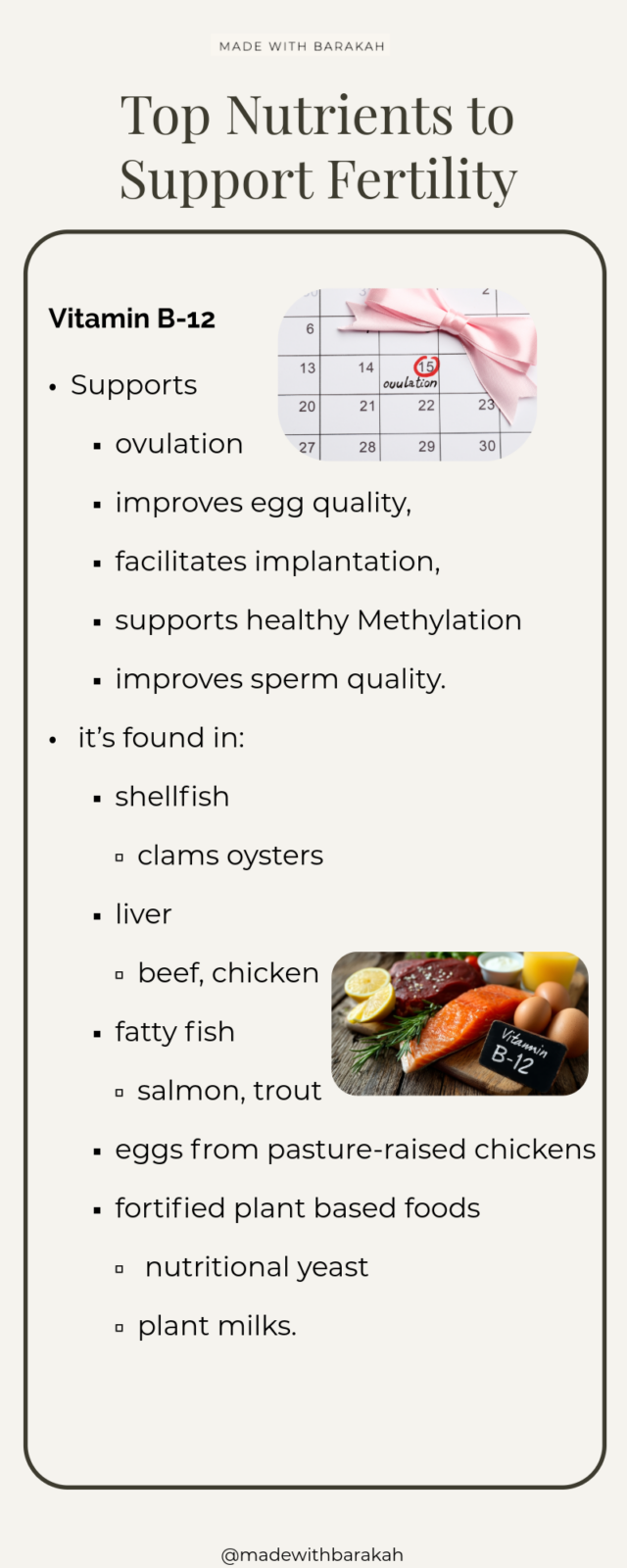 Vitamin B12: supports ovulation, improves egg quality, facilitates implantation, supports healthy methylation, improves sperm quality specifically through increasing sperm count, enhancing sperm motility, and reducing sperm DNA damage: it’s found in shellfish (clams, oysters), liver (beef, chicken), fatty fish (salmon, trout), eggs from pasture-raised chickens, and fortified plant based foods like nutritional yeast, plant milks.