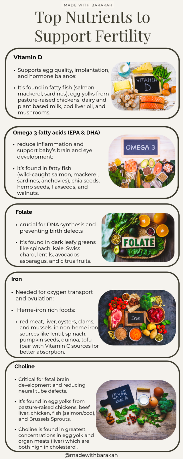 Vitamin D: supports egg quality, implantation, and hormone balance: it’s found in fatty fish (salmon, mackerel, sardines), egg yolks from pasture-raised chickens, dairy and plant based milk, cod liver oil, and mushrooms.
