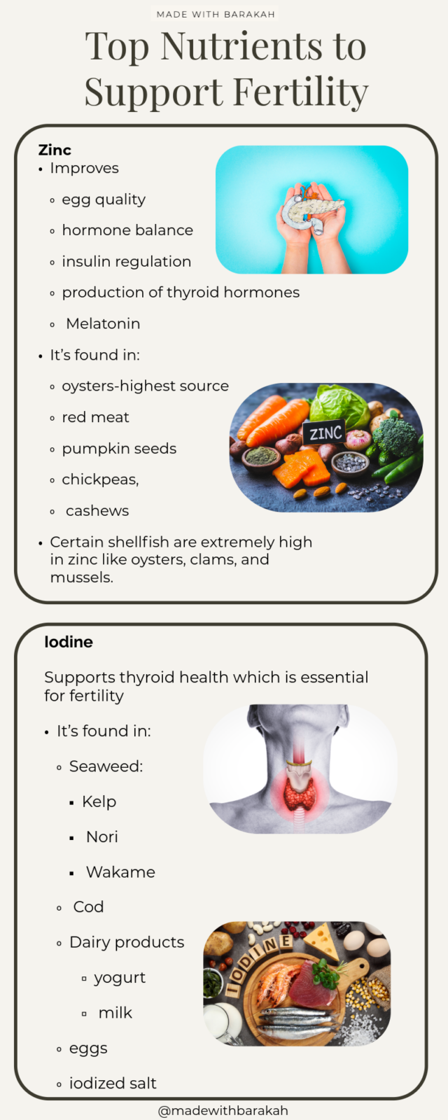 Iodine: supports thyroid health which is essential for fertility. It’s found in seaweed (kelp, nori, wakame), Cod, dairy products (yogurt, milk), eggs, and iodized salt.